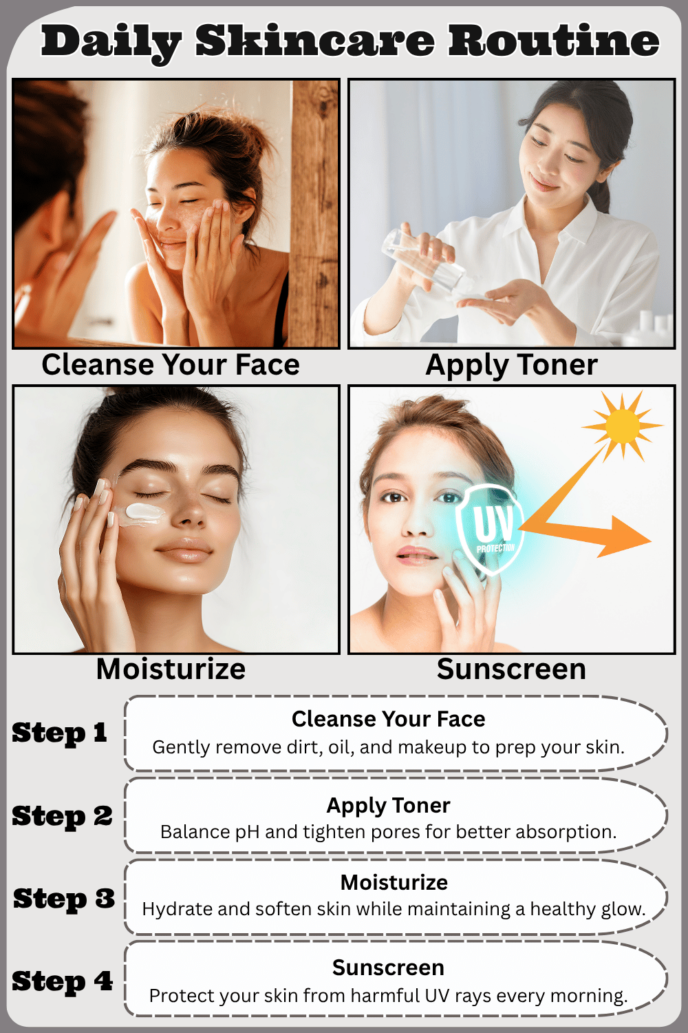 Moisturizing locks in hydration, prevents dryness, and keeps your skin soft and smooth throughout the day. Finally, sunscreen protects against harmful UV rays, preventing premature aging and dark spots, which is why it should never be skipped. By following this daily skincare routine consistently, you’re giving your skin the care it needs to stay healthy, radiant, and glowing.