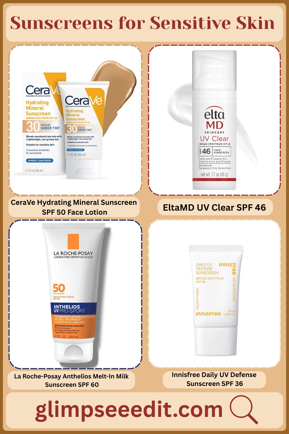 Look for fragrance-free, mineral, or dermatologist-recommended sunscreens for sensitive skin. Zinc oxide and titanium dioxide are gentle options that rarely cause irritation.