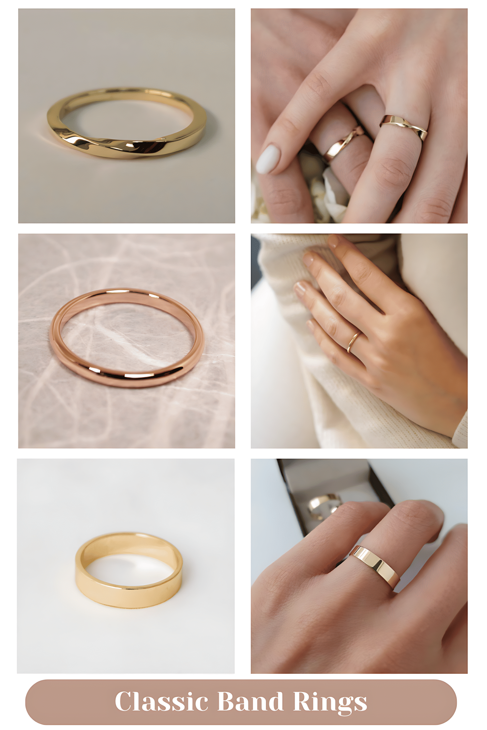 Classic band rings define timeless elegance. Their smooth, unadorned finish pairs with every outfit and remains a favourite for subtle sophistication. Whether you pick yellow gold, silver, or platinum, this simple style never goes out of fashion.