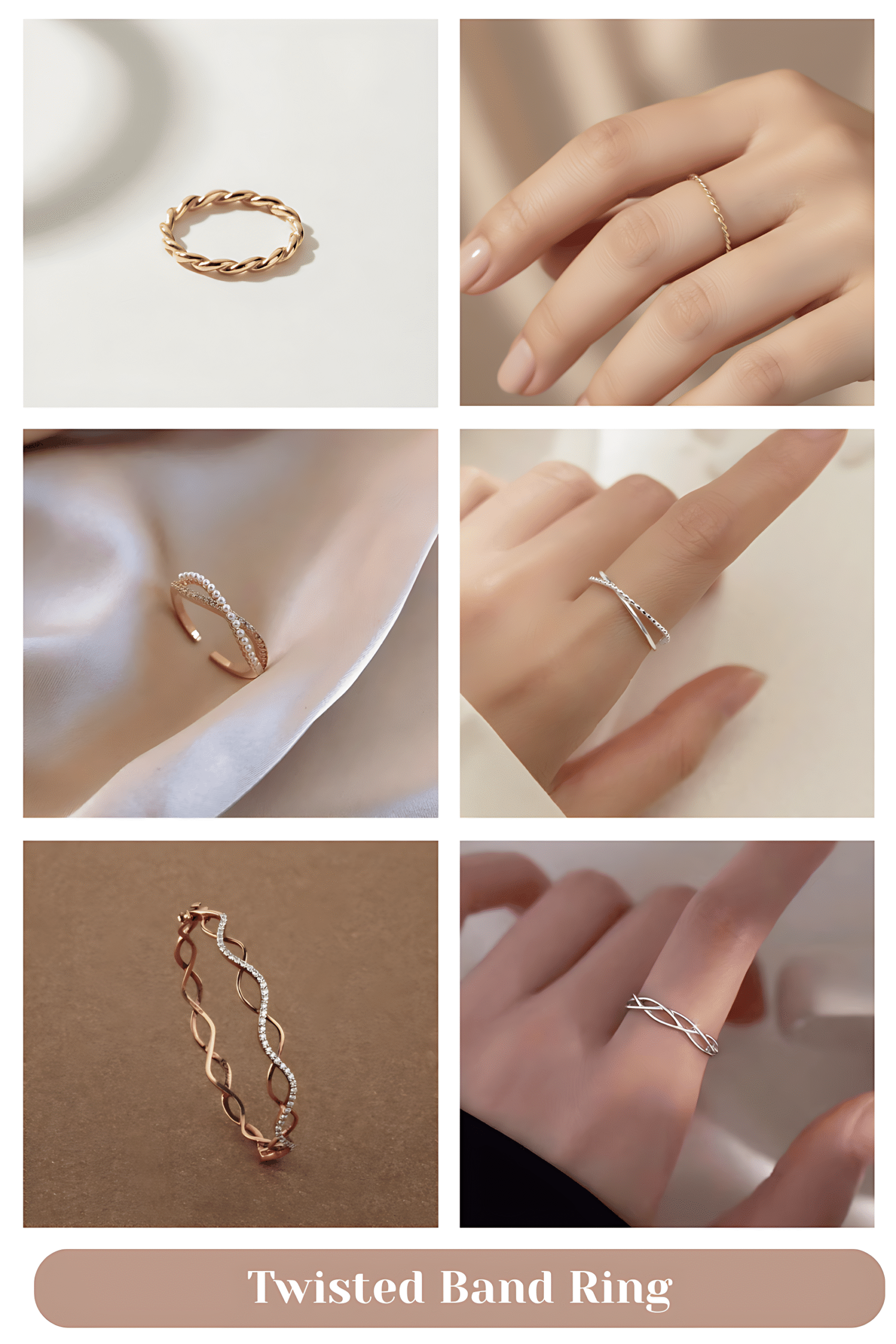 Twisted or textured bands add character to any collection. Rope-like patterns or hammered finishes provide depth and subtle detail, perfect when you want something different yet still elegant.