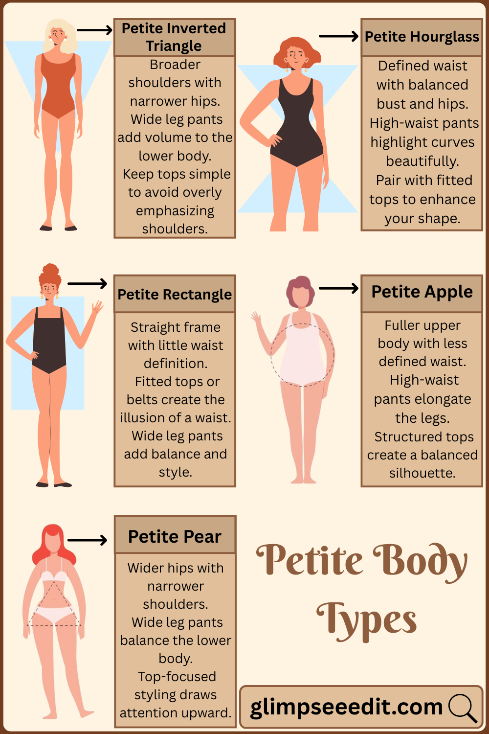 - Petite Inverted Triangle: Broader shoulders with narrower hips.