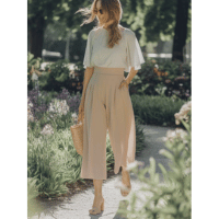 High-waist, cropped, tailored, and flowy lightweight fabrics pants are ideal for petite figures. These styles help elongate the legs, maintain proportion, and prevent the outfit from overwhelming a smaller frame.