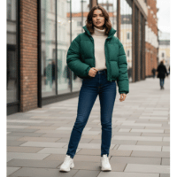 Winter outfits tend to feature darker tones, but that doesn’t mean you have to stick to black and gray. Mix earthy shades like olive, camel, and navy for a fresh yet timeless feel. You can also play with textures — a smooth parka with a wool scarf, or a shiny puffer paired with matte boots, creates contrast that feels intentional and chic. Always aim for harmony between your jacket and the rest of your outfit so that everything flows naturally together.